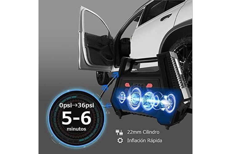 Alta eficiencia y bajo consumo: Inflador ruedas coche tiene un motor de cepillo DC de cobre puro, cilindro de 22mm, bajo consumo de energía de 120W, presión atmosférica máxima de 150PSI, 35L/MIN de inflación, 0-35PSI en 5 minutos