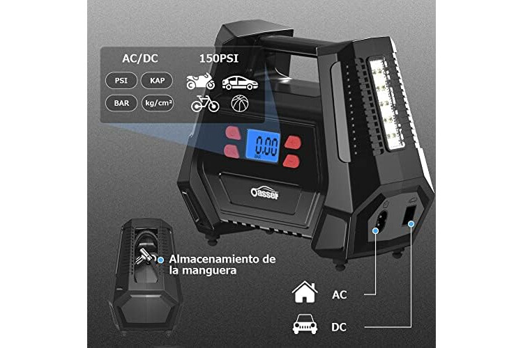 Oasser Inflador Ruedas Coche DC 12V y AC 220V Compresor Aire portatil con Pantalla LCD Luz LED Cable de 3M 150PSI para Coches, Motos y Bicicletas