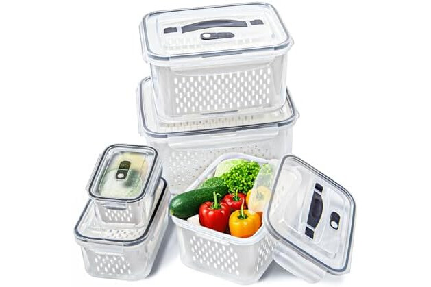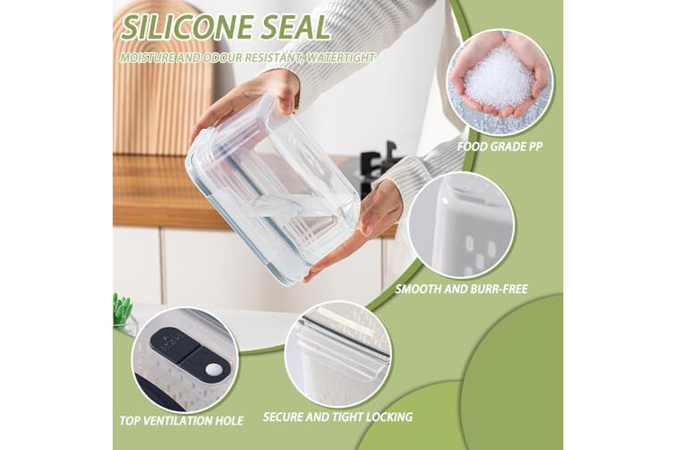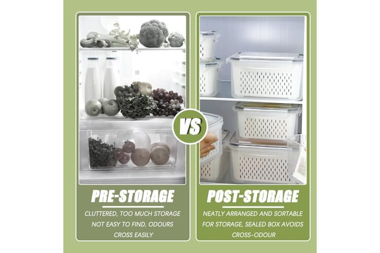 Separación seca y húmeda: Caja almacenamiento para frutas y verduras está equipado con una cestas de drenaje desmontable para drenar los alimentos y extender la vida útil de los mismos. La tapa tiene un sello de ventilación para evitar que los alimentos se derramen