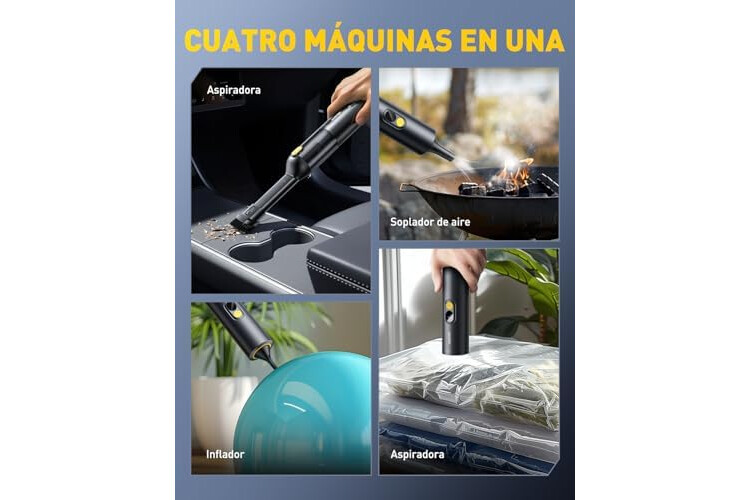 【Aspiradora sin cable coche multifuncional 4 en 1】La mini aspiradora coche AUXITO está equipada con múltiples boquillas para satisfacer perfectamente tus necesidades de aspirado, soplado, inflado y bombeo. Limpia rápidamente asientos de coche, maleteros, alfombrillas, teclados de ordenador, sofás, alfombras y todas las zonas de difícil acceso. También puede inflar pelotas de yoga, flotadores y otros inflables, y aspirar el aire de todo tipo de bolsas de almacenamiento para ahorrar espacio.