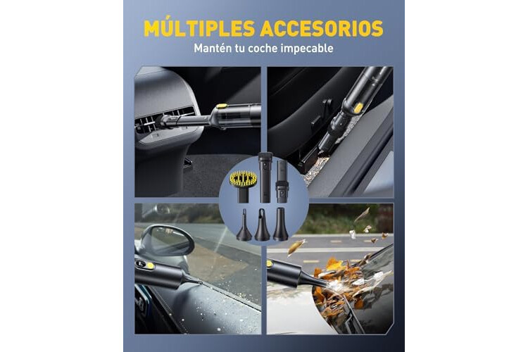 【Potente aspiradora de mano de 24000 Pa】Esta aspiradora de coche potente cuenta con un motor sin escobillas de alta velocidad mejorado para una limpieza potente. Gracias a sus dos niveles de succión ajustables y seis accesorios diferentes, elimina fácilmente el pelo de mascotas, las migas, el polvo y la arena de los asientos del coche y los sofás.