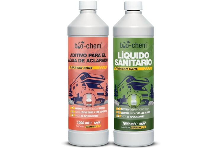Bio-Chem - Set de 2 Productos de Limpieza para aseos de autocaravanas y caravanas - Líquido Sanitario 1 l y aditivo Sanitario 1 l - Nueva fórmula con microorganismos para aseos químicos de caravanas