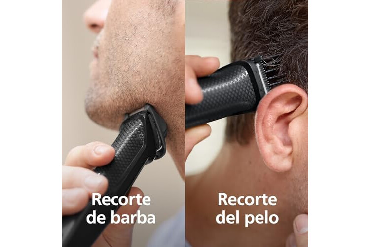 El juego incluye: 1 mango Multigroom, 1 cuchilla metálica, 1 recortador para nariz y orejas, 1 peine-guía para barba ajustable de 3-7 mm, 2 peines-guía para barba de dos días, 3 peines-guía para el pelo.