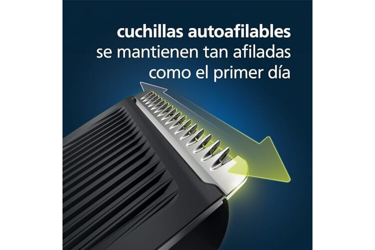 Recortador eléctrico fiable para hombres con cuchillas autoafilables de acero inoxidable que permanecen afiladas como el primer día para un rendimiento duradero sin necesidad de lubricación.