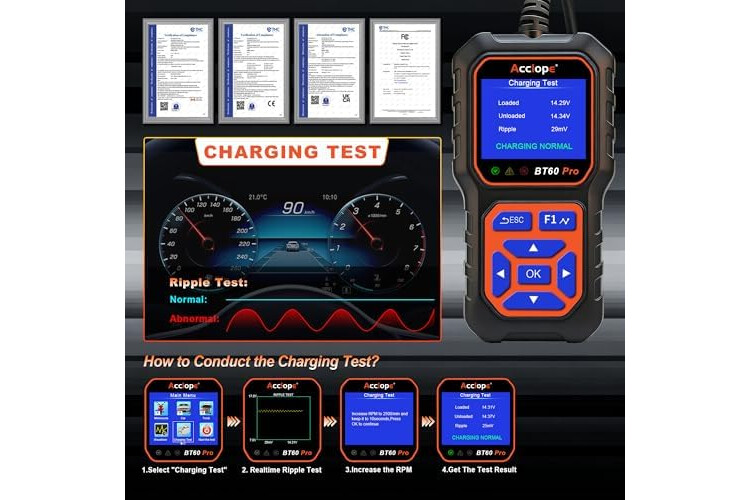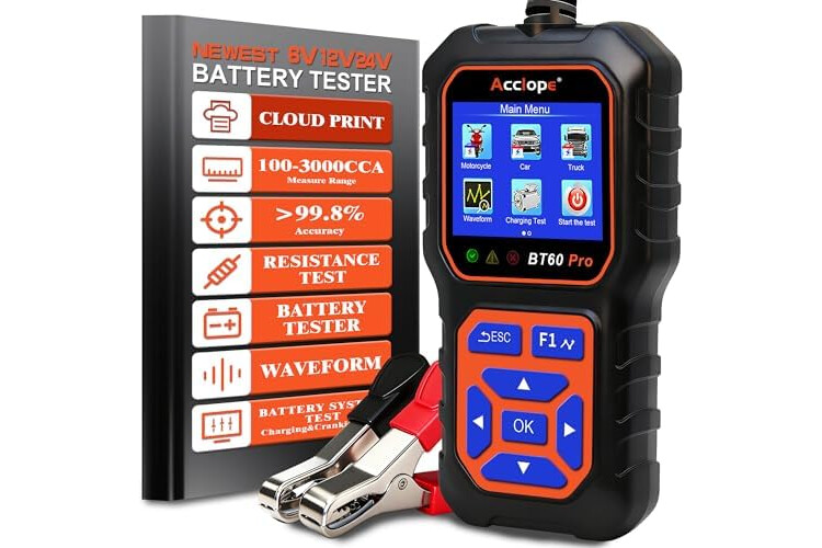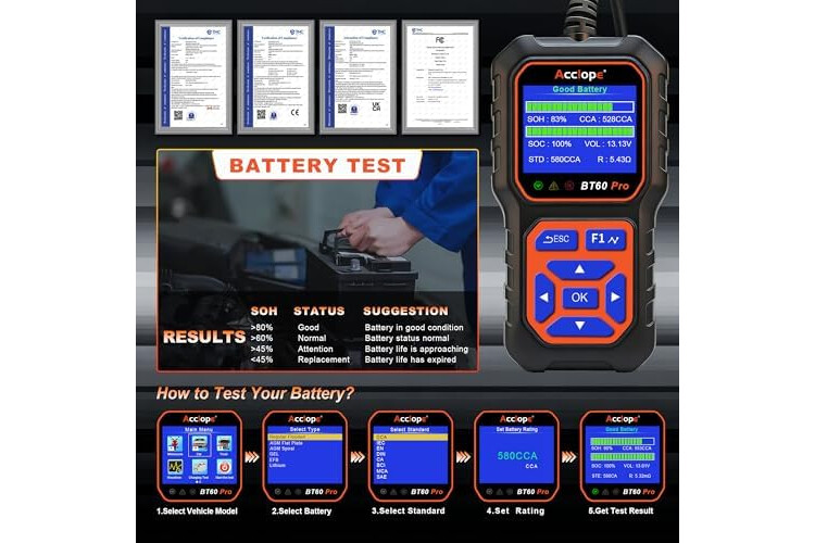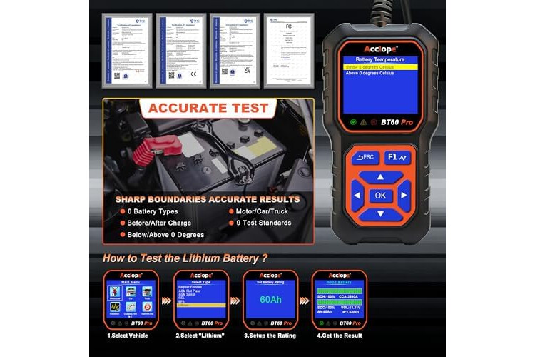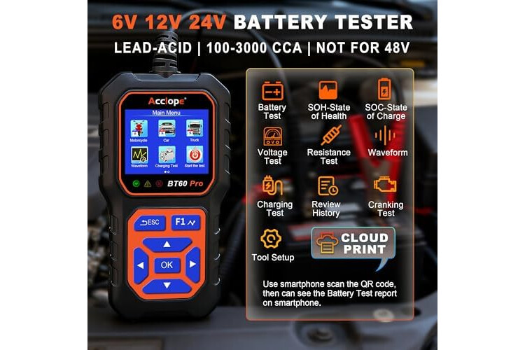 Compatibilidad amplia con baterías: El ACCLOPE BT60 PRO es compatible con baterías de 6V, 12V y 24V, incluyendo baterías de plomo-ácido, AGM, GEL, EFB y litio. Su versatilidad permite aplicaciones en automóviles, motocicletas, camiones, embarcaciones y dispositivos domésticos. Este probador de baterías se convierte en una herramienta esencial tanto para profesionales como para usuarios aficionados, proporcionando diagnósticos confiables para diversas necesidades de prueba y mantenimiento.