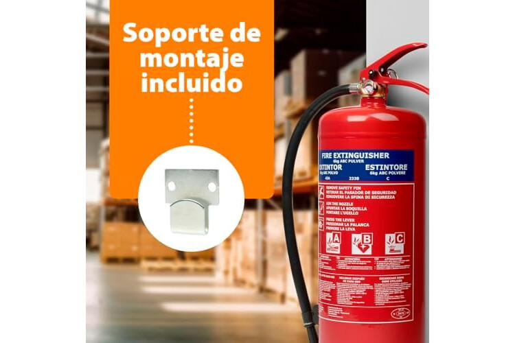 Se incluye un soporte de pared para colocar el extintor en lugares estratégicos, como la cocina, por ejemplo, y facilitar su montaje en la pared; todo lo que tienes que hacer es coger el extintor y podrás reaccionar óptimamente en caso de incendio