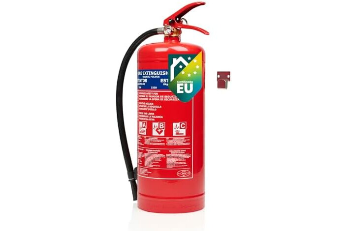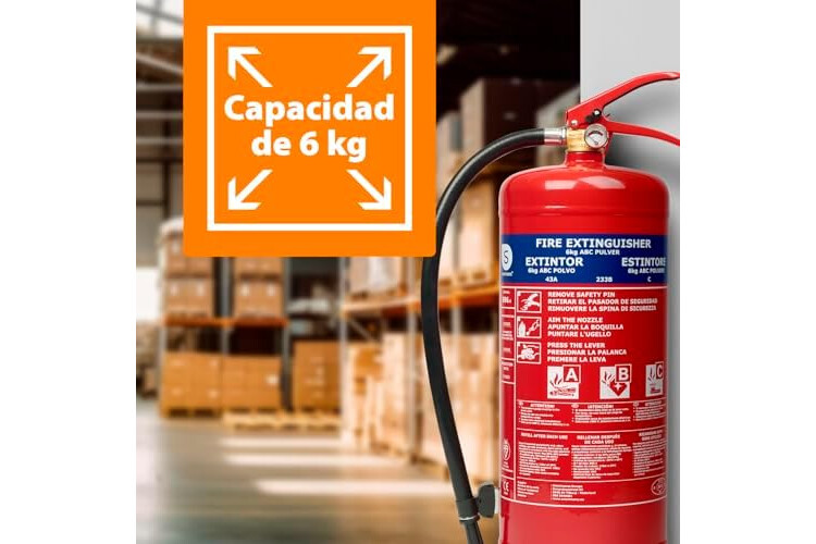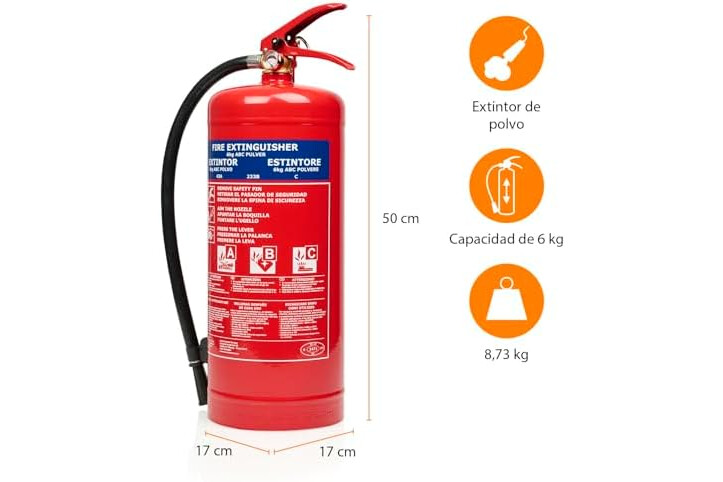 Este extintor de polvo seco tiene una capacidad de 6 kg; es adecuado para usar en casa, en su cobertizo, pero también en vehículos más grandes; ten cuidado de no utilizarlo cerca o sobre sus dispositivos electrónicos, ya que el polvo los dañaría