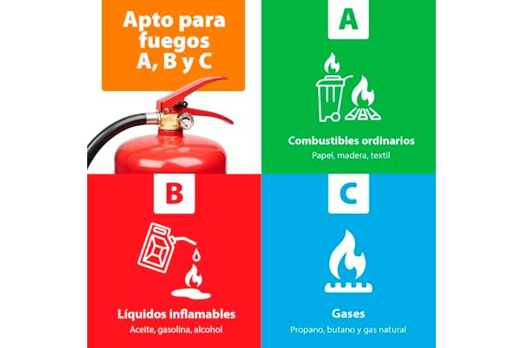 Este extintor de polvo seco es versátil: sirve para fuegos de clase A, materiales sólidos, como madera y papel, fuegos de clase B, líquidos y metales fundidos, aceites, etc., y fuegos de clase C, fuegos de gas, como propano, butano, gas natural, etc