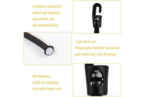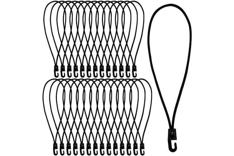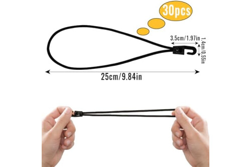 El paquete incluye: 30 tensores de goma estirados negros con ganchos, cada uno de 25 cm de largo, en un conjunto de gran capacidad para satisfacer sus diferentes necesidades.