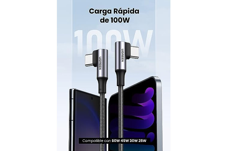 UGREEN Cable USB C PD 100W, Tipo C Carga Rápida 90 Grados Compatible con Macbook iPad iPhone 17 Pro Max Air/iPhone 16/15 Plus Pro MAX, Galaxy S25 S24 S23 S22, Pixel 6 7 8 9. 3M