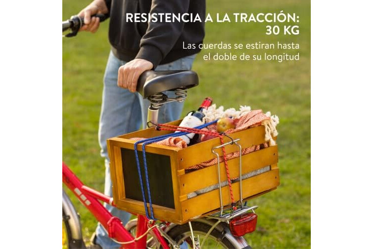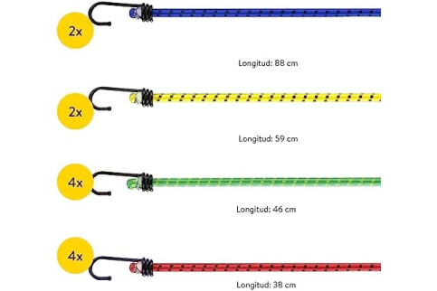 Correa Elástica y Duradera: Disfruta de un almacenamiento y transporte seguro en la bici o en el coche con esta 12x cuerda elástica con gancho. El set incluye 4 longitudes de diferentes colores, que para encontrar siempre la longitud que necesites.
