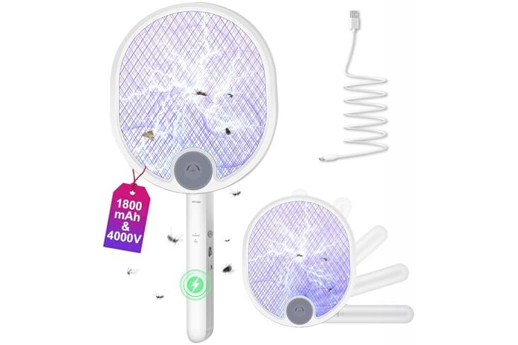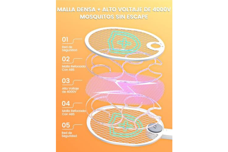 Raqueta Mosquitos Eléctrico Plegable 4000V 1800mAh USB 3 en 1 Recargable Mosquito Killer Trampa Mosquitos Portátil 3 Capas Malla de Seguridad Base Soporte de Pared Interior Exterior