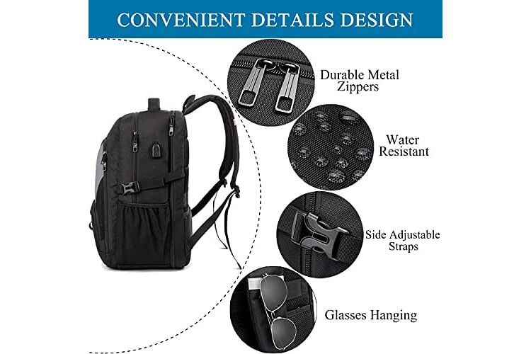 GRAN CAPACIDAD -Mochila de viaje para hombres con 20 bolsillos, 3 compartimentos principales, 1 compartimento acolchado para la funda del portátil, 1 bolsillo frontal con cremallera, ambos bolsillos laterales exteriores para guardar botellas de agua o paraguas, 12 bolsillos interiores para útiles universitarios, accesorios de viaje, ropa, papelería, cuaderno, archivadores 1 bolsillo antirrobo para proteger sus pertenencias.