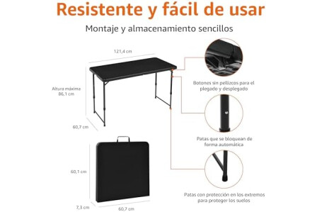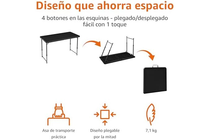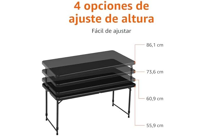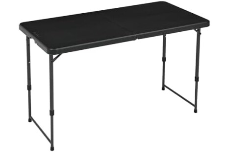 Amazon Basics Mesa Plegable Rectangular de 1.2 m, 4 ajustes de Altura, asa de Transporte, Interiores y Exteriores, portátil, Ligera, de Viaje, Picnic, Camping, Negro Lavado, 121.4 x 60.7 x 86.1 cm