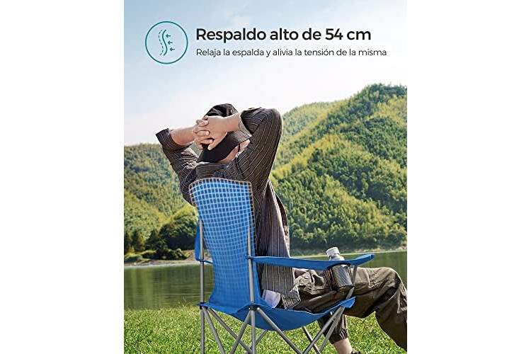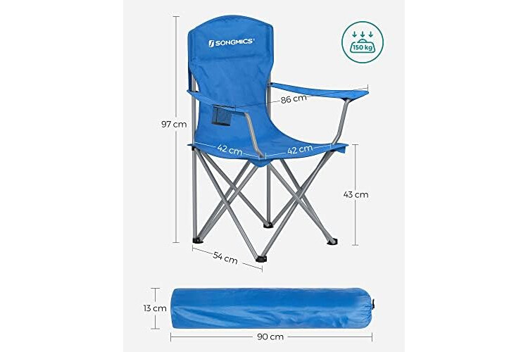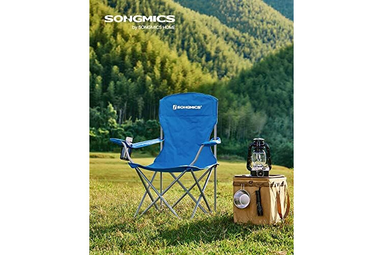 SONGMICS Sillas de Camping, Juego de 2 Sillas de Exterior, Respaldo Alto, Apoyabrazos, Bolsillo para Tazas, Portátil, Plegable, Carga de 150 kg, Acampada, Jardín, Pesca, Terraza, Azul GCB08BU