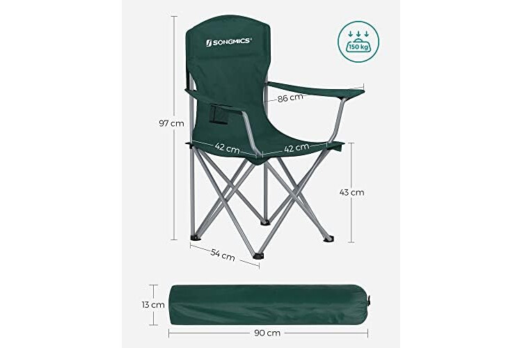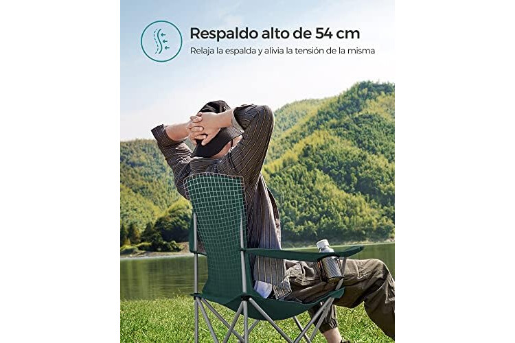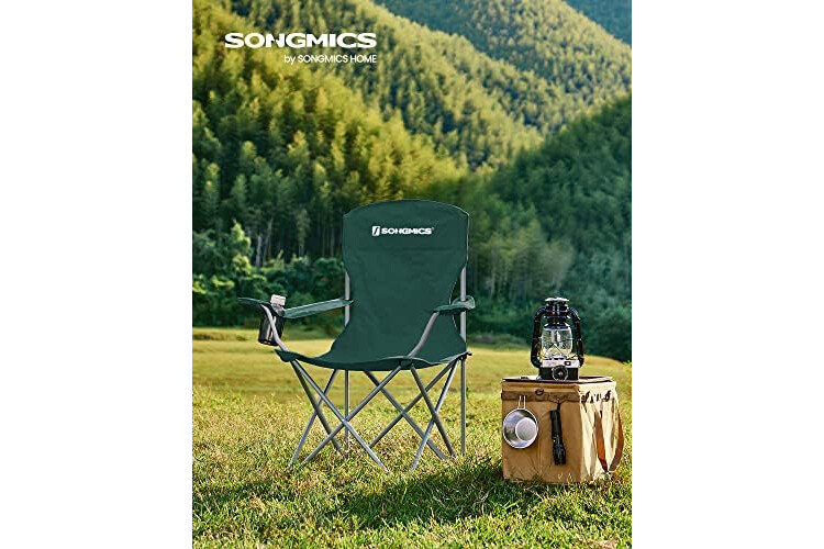 SONGMICS Sillas de Camping, Juego de 2 Sillas de Exterior, Respaldo Alto, Apoyabrazos, Bolsillo para Tazas, Portátil, Plegable, Carga de 150 kg, Acampada, Jardín, Pesca, Terraza, Verde Oscuro GCB08GN