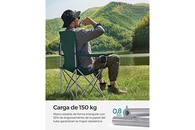 [Capacidad de carga de 150 kg] Marco de acero, tubos de 0,8 mm de grosor, muy resistente; tela Oxford 600D con revestimiento resistente al agua, extra resistente al desgaste y duradero. La silla de camping soporta hasta 150 kg