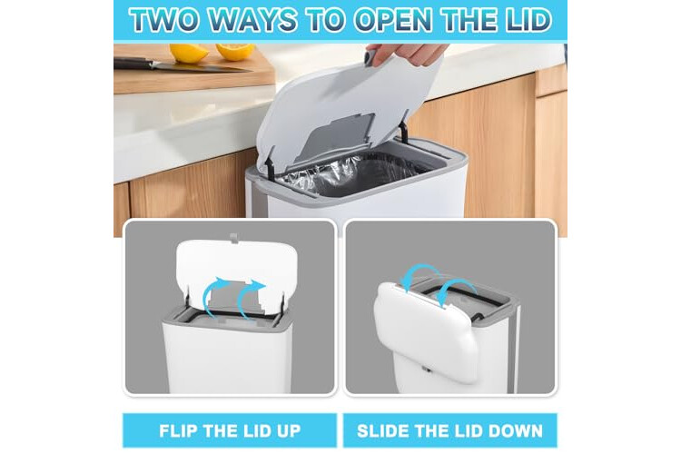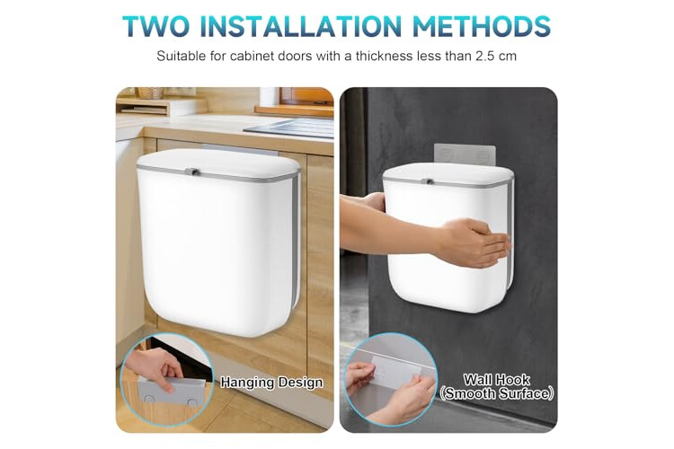 2 Formas de Abrir : El Cubo de Basura Colgante con Tapa tiene 2 maneras de abrir la tapa, puede elegir abrirla hacia arriba o hacia abajo según su propia preferencia, además, también hay un anillo de fijación para las bolsas de basura dentro del cubo de basura, que evita eficazmente que las bolsas de basura se deslicen.