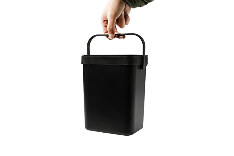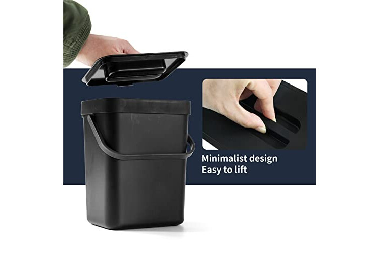 Diseño con tapa: La tapa puede extraerse fácilmente y colgarse del borde o del asa del cubo basura reciclaje. Cuando la tapa está cerrada, evita que se escapen los olores y protege la salud de su familia.