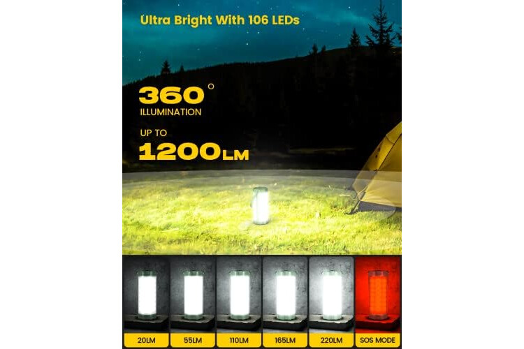 [𝟏𝟐𝟎𝟎𝐋𝐌 & 𝟓 𝐍𝐢𝐯𝐞𝐥𝐞𝐬 𝐁𝐫𝐢𝐥𝐥𝐨] Con 106 LED distribuidos uniformemente, esta lámpara camping proporciona una iluminación brillante de 360° sin sombras. Ofrece 5 niveles de brillo para cualquier situación y un modo de emergencia de 1200 LM que funciona durante 3 minutos para iluminar una amplia zona. Una linterna de camping fiable para las noches más oscuras y tormentosas.