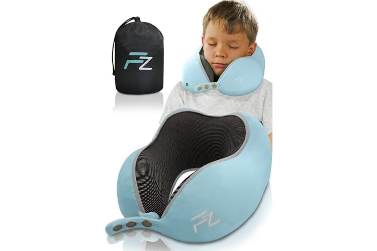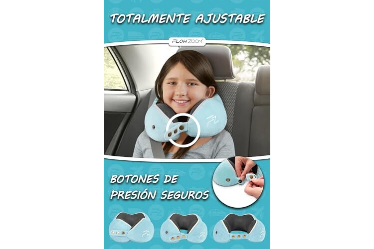 FLOWZOOM Comfy Kids Almohada de Viaje para Niños Mayores de 6 Años – Cojín Ajustable con Funda Suave y Lavable – Cojín de Viaje Viscoelástica para Coche, Tren y Avión - Azul, Talla M (6-10 Años)