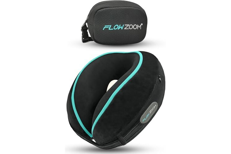 FLOWZOOM Dream Almohada de Viaje Viscoelástica – Cojín de Cuello Ajustable con Soporte 360° y Laterales Altos, Funda de Felpa Suave y Lavable, con Bolsa Compacta – para Avión, Coche y Tren – Negro