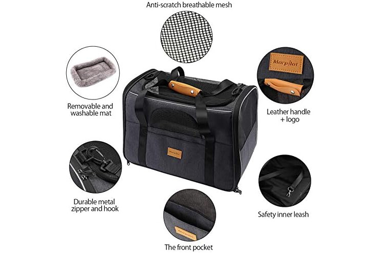 Transportín Perro Gato, Bolsa de Transporte Transpirable para Mascotas, Portador de Viaje con Correa de Hombro Ajustable, Transporte de Gato con Colchón Suave + Tazón Plegable (18 * 12.5 * 14 Inch)