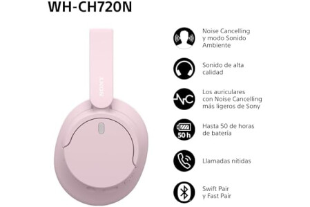 SONY WH-CH720N Auriculares Inalámbricos Bluetooth Noise Cancelling de Diadema, Sonido, Modo Sonido Ambiente, Diseño Ligero, hasta 50 Horas de batería, iOS y Android - Rosa