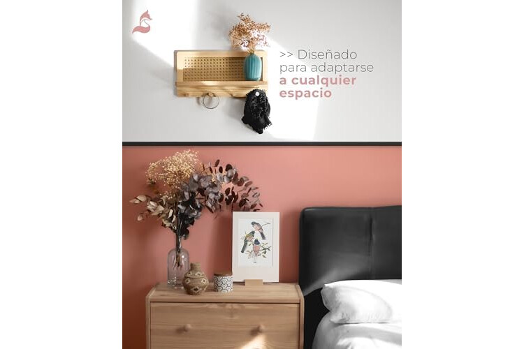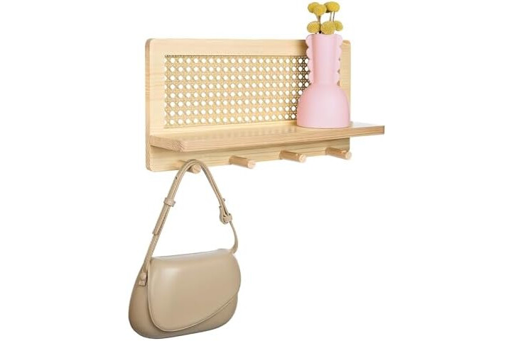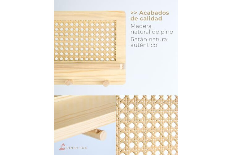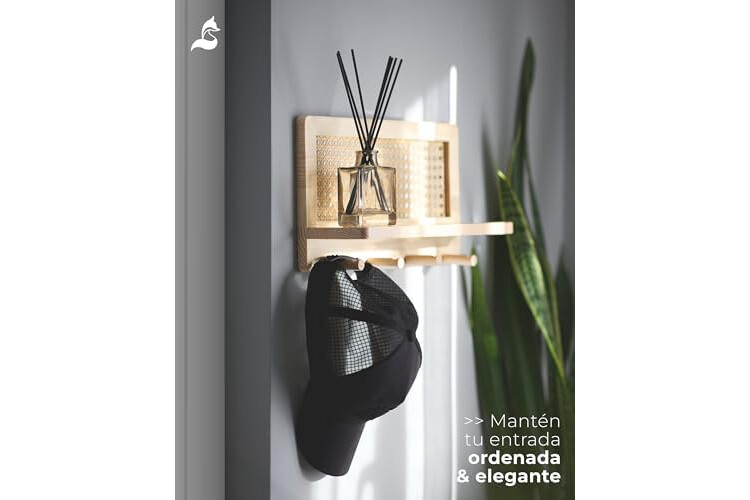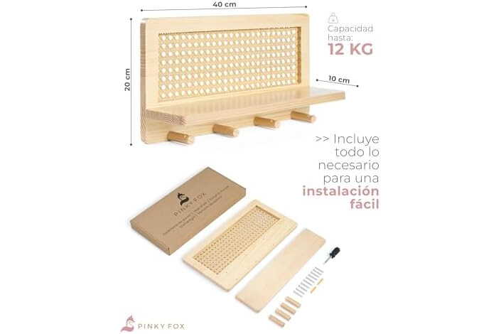 Perchero de pared con estante fabricado en madera de pino y ratán natural, ideal para entradas, dormitorios y recibidores. Diseño cálido y artesanal que combina funcionalidad y estilo, permite colgar chaquetas, bolsos y mochilas mientras mantiene llaves y pequeños objetos organizados. Soporta hasta 12 kg, incluye tornillos, tacos y destornillador para una instalación rápida. Solución decorativa, resistente y sostenible para mantener el orden con personalidad en tu hogar.