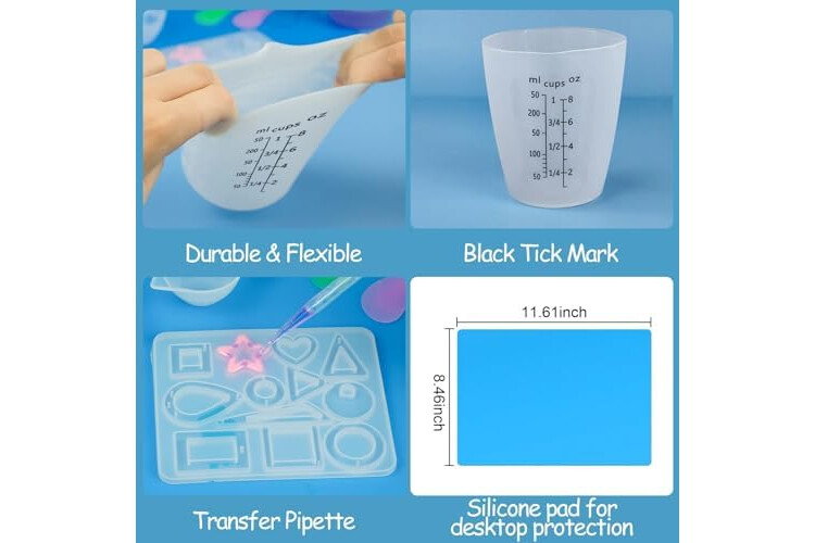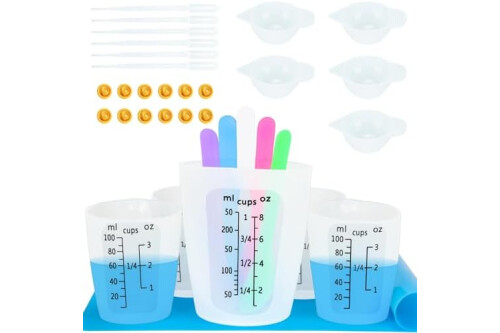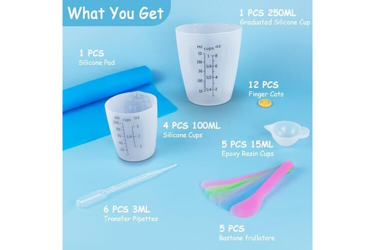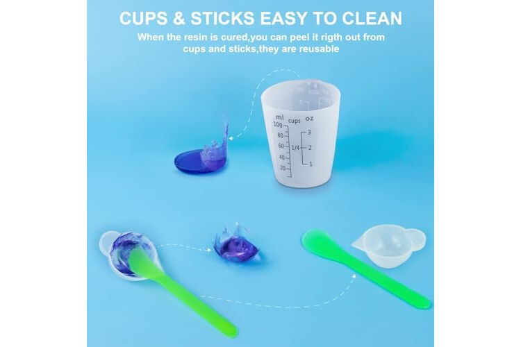La limpieza es muy fácil: las tazas medidoras, los palos agitadores y las almohadillas del juego están hechas de silicona. Se puede despegar directamente cuando la resina esté seca. Es realmente adecuado para mezclar resina, pintura y manualidades de resina, fabricación de vidrio con purpurina.
