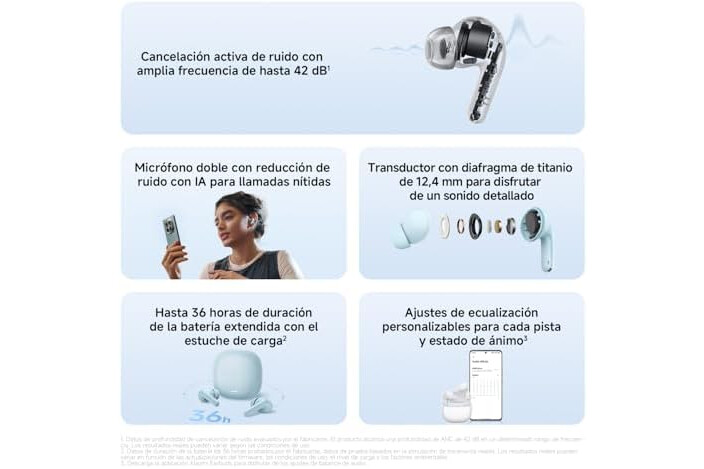 Hasta 42 dB de cancelación activa de ruido de banda ancha Disfruta de una cancelación de ruido más eficaz. La solución híbrida de ANC, con micrófonos integrados, detecta y reduce con precisión una amplia variedad de ruidos de baja frecuencia, como el sonido del metro o el aire acondicionado, creando un entorno de escucha mucho más silencioso y cómodo.