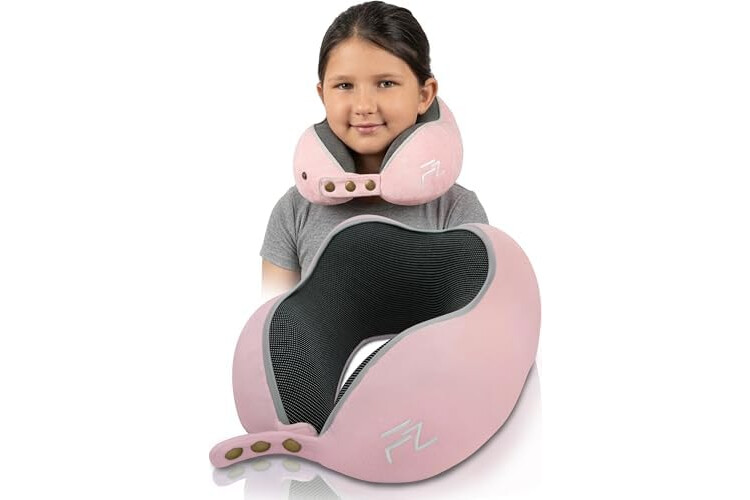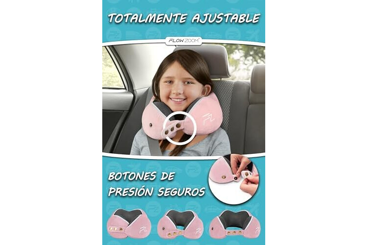 FLOWZOOM Comfy Kids Almohada de Viaje para Niños Mayores de 6 Años – Cojín Ajustable con Funda Suave y Lavable – Cojín de Viaje Viscoelástica para Coche, Tren y Avión - Rosa, Talla M (6-10 Años)