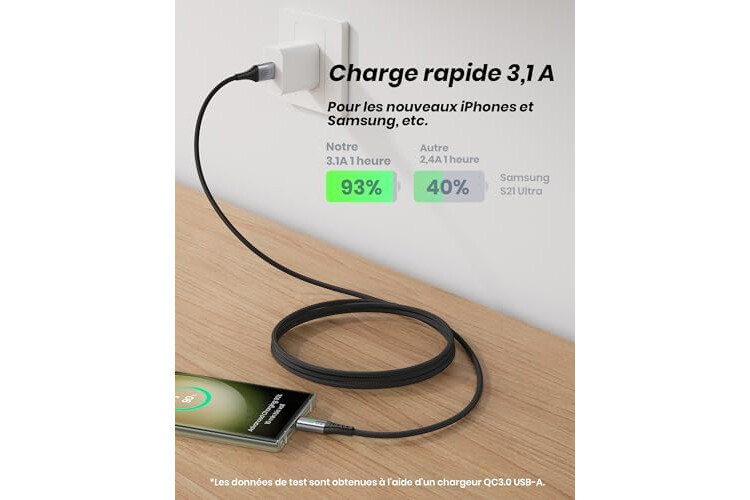 Carga Rápida 3.1A: Los cables de cobre superconductores integrados proporcionan una salida segura y real de 3.1A para cargar su dispositivo a una velocidad vertiginosa. De este modo, puede aumentar el porcentaje de su teléfono del 0 al 93% en una hora a una velocidad increíble.