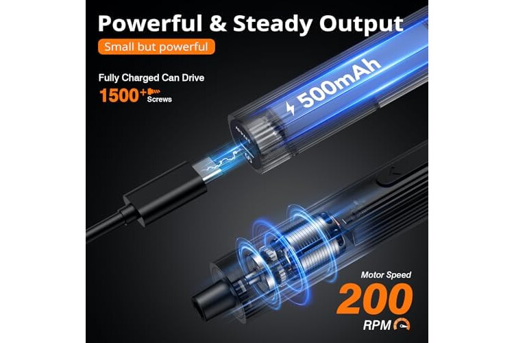 【Resistencia de Larga Duración】 Equipado con cable de carga rápida USB, 1 hora de carga completa, puede trabajar continuamente durante 1,5 horas, desenroscar 1500 tornillos, fácil de completar el desmontaje de equipos electrónicos de precisión.