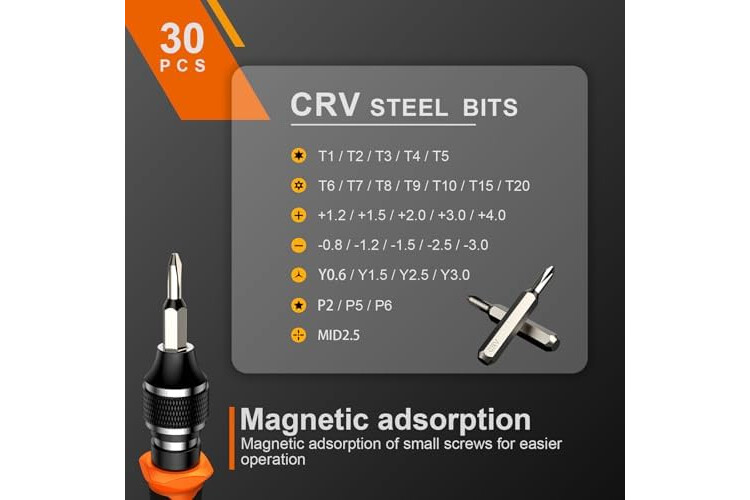 【Mango giratorio antideslizante】-- Todas nuestras puntas de destornillador están hechas de acero CR-V de alta calidad. Las puntas de destornillador CR-V no se oxidan fácilmente y no son propensas a romperse. La parte superior del mango del destornillador tiene un diseño giratorio que hace que sea más conveniente para quitar los tornillos; la cabeza del mango y la cabeza del tornillo tiene adsorción magnética que puede reemplazar rápidamente los tornillos.
