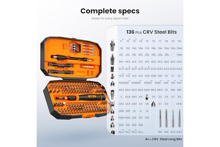 【Juego de Destornilladores de Precisión】 El juego tiene 140 puntas, múltiples modelos, incluyendo cabeza de ciruela, cabeza Phillips, cabeza pentagonal, estrella, triple ala, triangular, etc., cubriendo la mayoría de las especificaciones de los modelos de destornilladores en el mercado.4 puntas largas pueden ayudarle a quitar tornillos más profundos, y algunas puntas de destornilladores de uso común también están equipadas con 2-3 puntas del mismo tipo como repuesto.