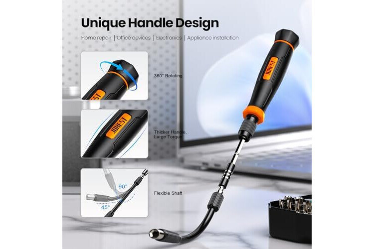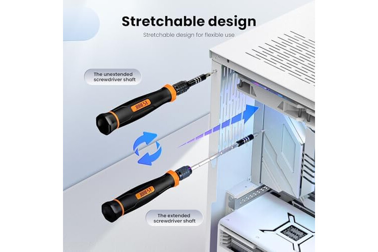 【Diseño de Mango único y Material CRV】el mango está hecho de materiales PP y TPR, la cola es giratoria y adopta un diseño de barra de herramientas extendida. La longitud de la barra de herramientas se puede ajustar, lo que facilita el acceso profundo para el desmontaje. Las puntas de destornillador están hechas de acero CRV de alta calidad, resistente al desgaste y de alta dureza.