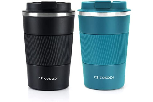 CS COSDDI Tazas de viaje, paquete de 2 tazas de café aisladas con tapa a prueba de fugas, tazas de café reutilizables de viaje, taza de café para coche(azul + negro)
