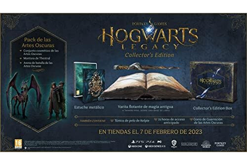 Hogwarts Legacy: La Collector's Edition incluye el juego, una varita flotante de magia antigua a tamaño real sobre una base de libro, un estuche metálico, una túnica de pelo de kelpie, una montura de thestral, una arena de batalla de las Artes Oscuras, un conjunto cosmético de las Artes Oscuras, un gorro de guarnición de las Artes Oscuras y 72 horas de acceso anticipado