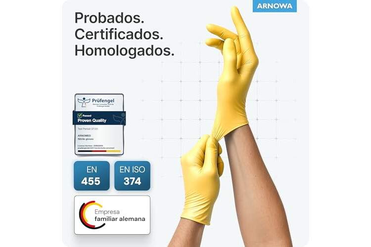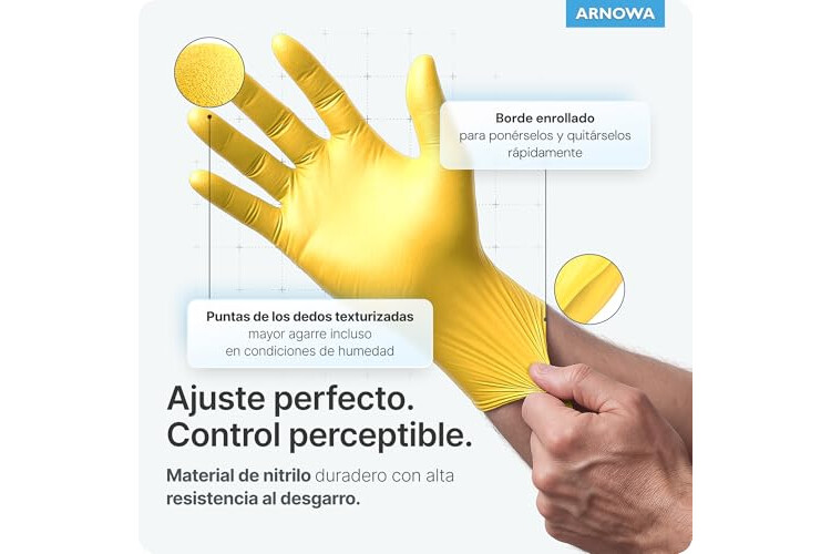 RESISTENTE AL DESGARRO Y ANTIDESLIZANTE ✓ Los guantes desechables ARNOMED DE NITRILO AMARILLO son más gruesos y resistentes al desgarro que los guantes de nitrilo convencionales. Gracias a las puntas de los dedos texturizadas, los guantes de nitrilo ofrecen no sólo una protección fiable, sino también una adherencia óptima en condiciones de humedad.