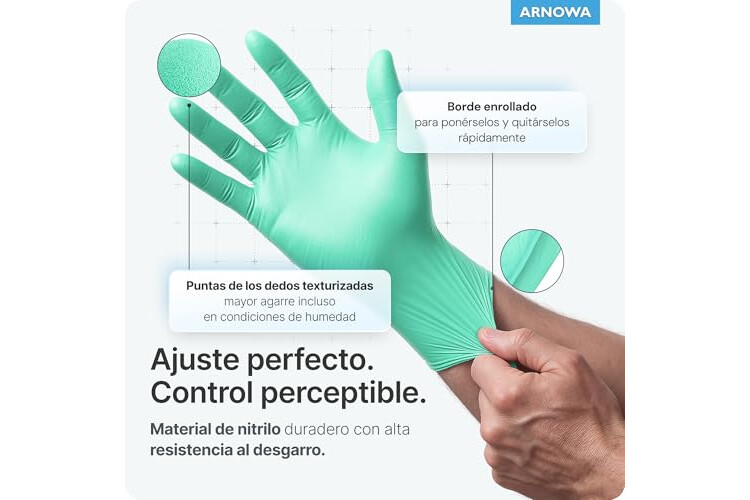 RESISTENTE AL DESGARRO Y ANTIDESLIZANTE ✓ Los guantes desechables ARNOMED DE NITRILO VERDES son más gruesos y resistentes al desgarro que los guantes de nitrilo convencionales. Gracias a las puntas de los dedos texturizadas, los guantes de nitrilo ofrecen no sólo una protección fiable, sino también una adherencia óptima en condiciones de humedad.