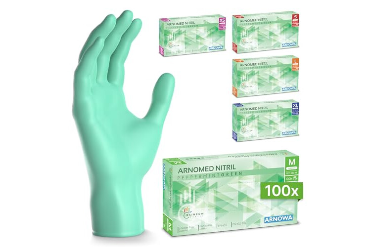 100x ARNOMED® Guantes nitrilo talla M Verde, Guantes desechables quirurgicos y laboratorio, Luvas nitrilo descartaveis sin polvo y látex, Manoplas nitrilo en XS, S, M, L, XL, XXL