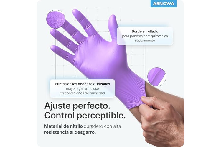RESISTENTE AL DESGARRO Y ANTIDESLIZANTE ✓ Los guantes desechables ARNOMED DE NITRILO VIOLETA son más gruesos y resistentes al desgarro que los guantes de nitrilo convencionales. Gracias a las puntas de los dedos texturizadas, los guantes de nitrilo ofrecen no sólo una protección fiable, sino también una adherencia óptima en condiciones de humedad.