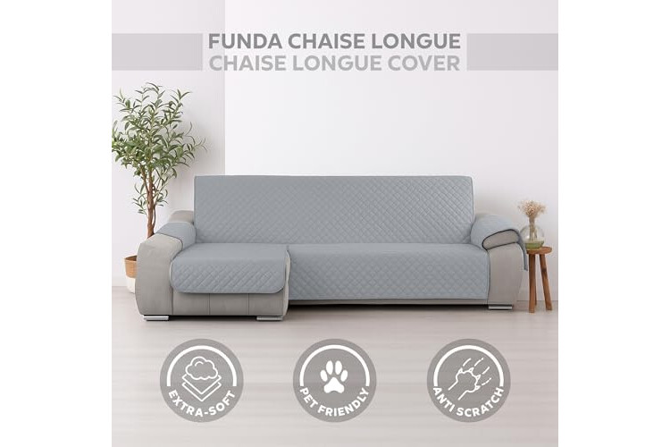 Textilhome Funda Cubre Sofá Chaise Longue Circus – Protector de Sofá Acolchado, Brazo Izquierdo (200 cm), Lavable y Resistente contra Manchas y Desgaste – Color Grisclaro (Visto de Frente)