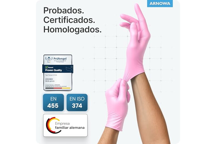 RESISTENTE AL DESGARRO Y ANTIDESLIZANTE ✓ Los guantes desechables ARNOMED DE NITRILO ROSA son más gruesos y resistentes al desgarro que los guantes de nitrilo convencionales. Gracias a las puntas de los dedos texturizadas, los guantes de nitrilo ofrecen no sólo una protección fiable, sino también una adherencia óptima en condiciones de humedad.