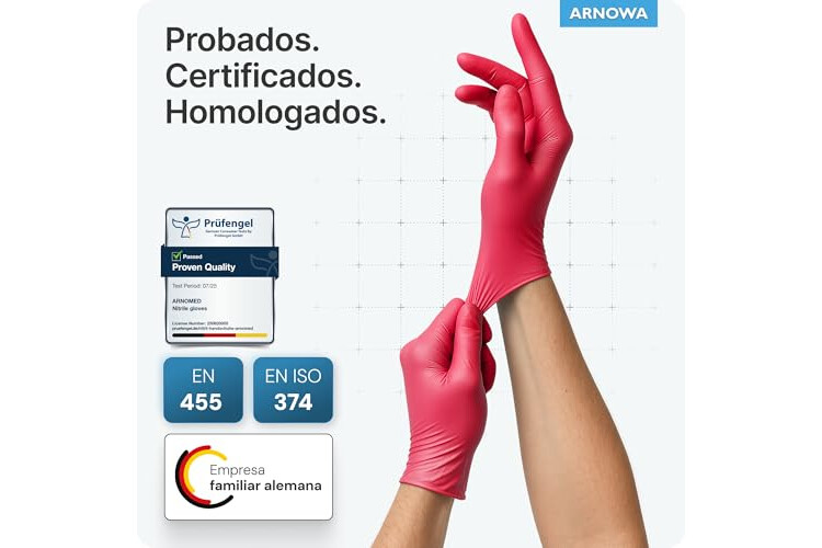 RESISTENTE AL DESGARRO Y ANTIDESLIZANTE ✓ Los guantes desechables ARNOMED DE NITRILO ROJO son más gruesos y resistentes al desgarro que los guantes de nitrilo convencionales. Gracias a las puntas de los dedos texturizadas, los guantes de nitrilo ofrecen no sólo una protección fiable, sino también una adherencia óptima en condiciones de humedad.