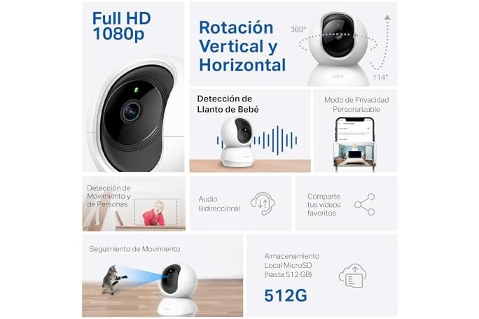 | Componentes incluidos | Tapo Pan/Tilt Home Security Wi-Fi Camera, Power Adapter, Mounting Plate, Mounting Screws, Camera Base, Quick Start Guide |