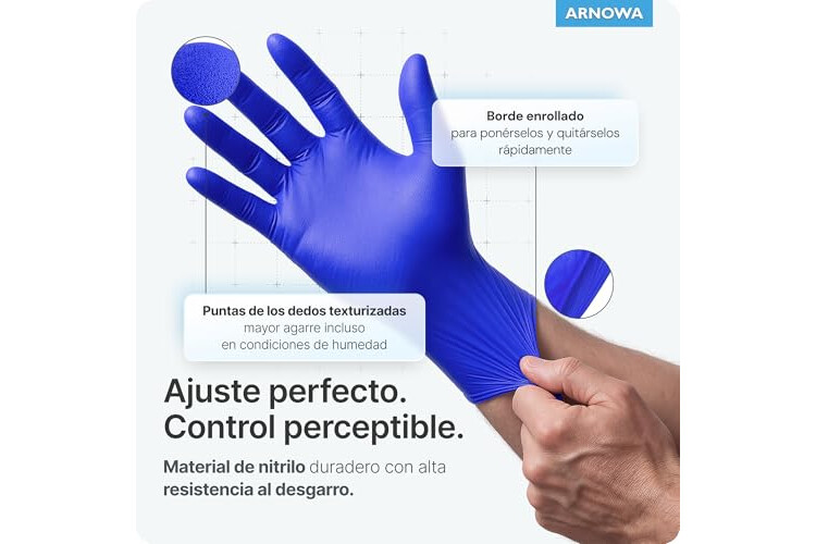 RESISTENTE AL DESGARRO Y ANTIDESLIZANTE ✓ Los guantes desechables ARNOMED DE NITRILO AZUL OCÈANO son más gruesos y resistentes al desgarro que los guantes de nitrilo convencionales. Gracias a las puntas de los dedos texturizadas, los guantes de nitrilo talla XL ofrecen no sólo una protección fiable, sino también una adherencia óptima en condiciones de humedad.