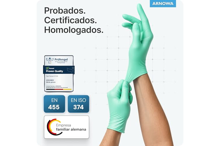 RESISTENTE AL DESGARRO Y ANTIDESLIZANTE ✓ Los guantes desechables ARNOMED DE NITRILO VERDES son más gruesos y resistentes al desgarro que los guantes de nitrilo convencionales. Gracias a las puntas de los dedos texturizadas, los guantes de nitrilo ofrecen no sólo una protección fiable, sino también una adherencia óptima en condiciones de humedad.