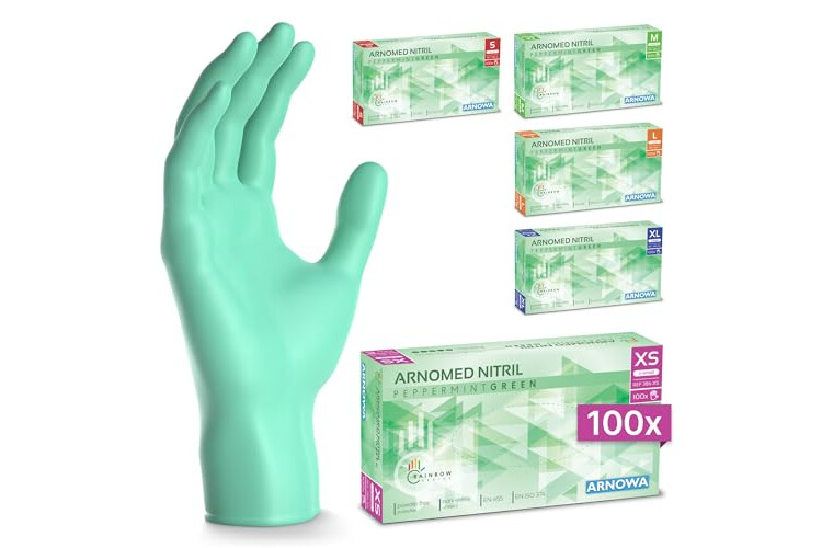 100x ARNOMED® Guantes nitrilo talla XS Verde, Guantes desechables quirurgicos y laboratorio, Luvas nitrilo descartaveis sin polvo y látex, Manoplas nitrilo en XS, S, M, L, XL, XXL